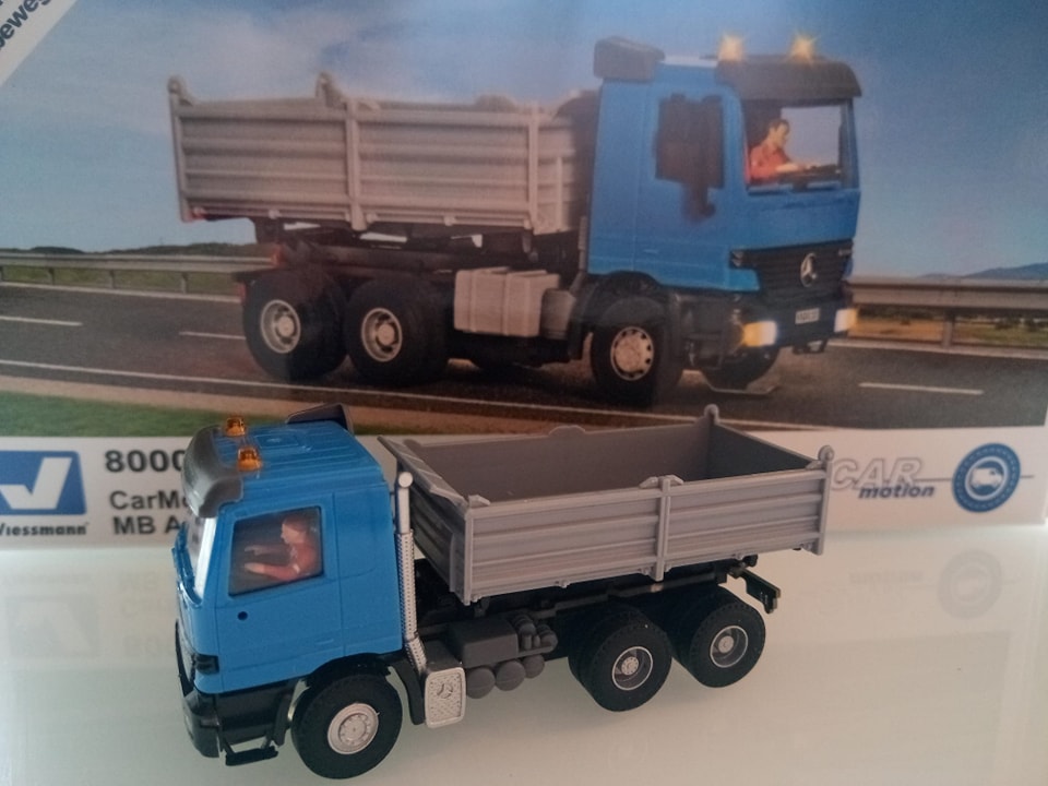 Heute haben wir das (Art. Nr. 8000) H0 Car Motion Basis Starterset, MB ACTROS , mit einem Muldenkipper mit Rundumleuchten, und den (Art. Nr. 8030) MB ACTROS 3-Achsen Sattelschlepper.